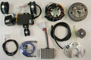 Nos systèmes donnent une puissance d\'éclairage de 75 w à 180 watts en fonction des modèles et des regulateurs et une étincelle à la bougie de 40000 volts au lieu de 15000 pour un allumage classique. Sauf indication contraire les systèmes : COMPETITION n\'ont pas d’éclairage et ne peuvent etre demarré qu\'à la poussette. tout ces systèmes comprennent un alternateur composé de : rotor, stator, régulateur et d\'un allumage électronique composé de : capteur interne ou externe, bobine simple ou double et pour les moteurs 4 temps une avance électronique programmable (16 courbes disponibles) .Ils peuvent fonctionner indifféremment avec ou sans batterie et pour tout les modèles non encore répertoriés, nous avons des solutions avec batterie.